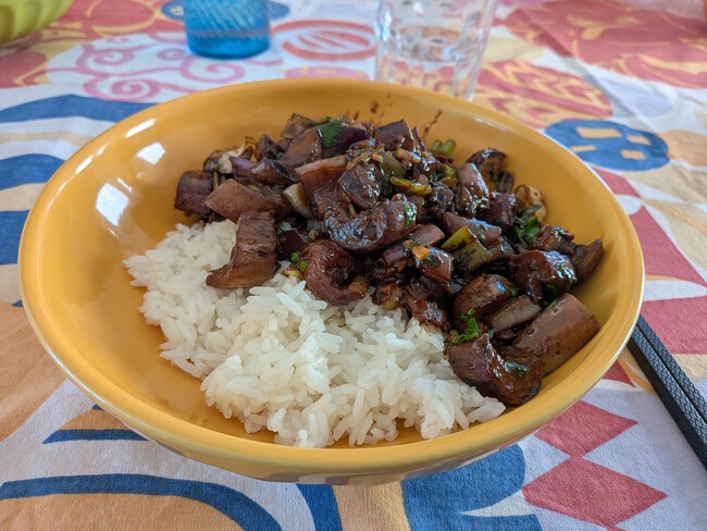 Esta berenjena pide a gritos la compañía de un bol de arroz blanco. Yo, de hecho, la serví directamente sobre un arroz jazmín, la guarnición asiática por excelencia.