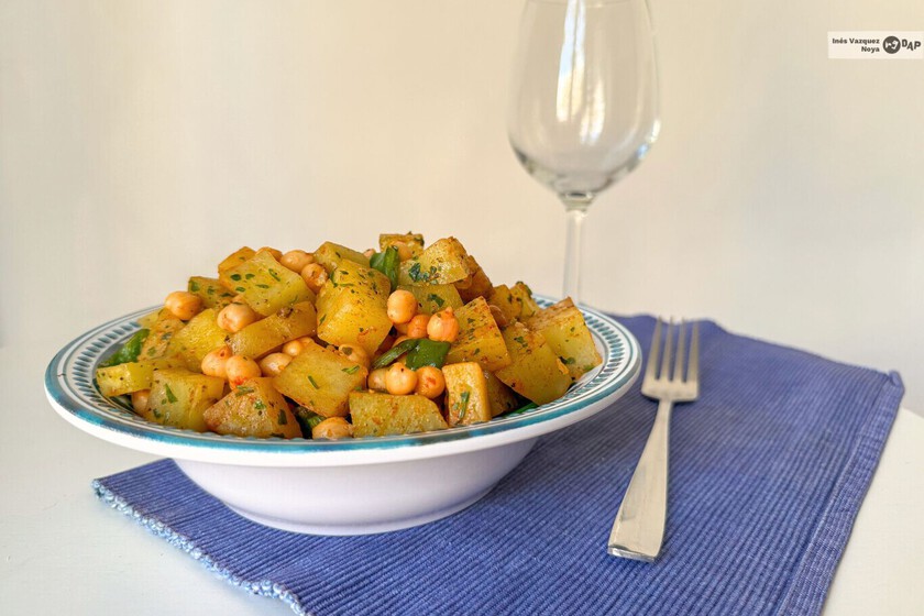 A nivel nutricional, este plato tiene muchísimo que ofrecer. La combinación de la proteína vegetal y la fibra de los garbanzos con los carbohidratos de absorción lenta de la patata se evita esa molesta sensación de pesadez justo antes de irte a dormir.