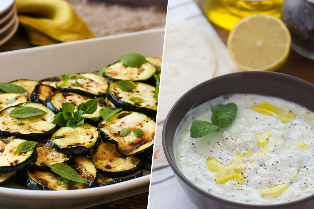 El tzatiki además suma más elementos al plato, como el pepino, el ajo, la menta y el limón, y no olvidemos que los pepinos son primos del calabacín, por lo que se complementan muy bien. El calabacín marinado con ajo y albahaca es una adaptación de la receta de la tradicional concia, y por sí solo ya está buenísimo.