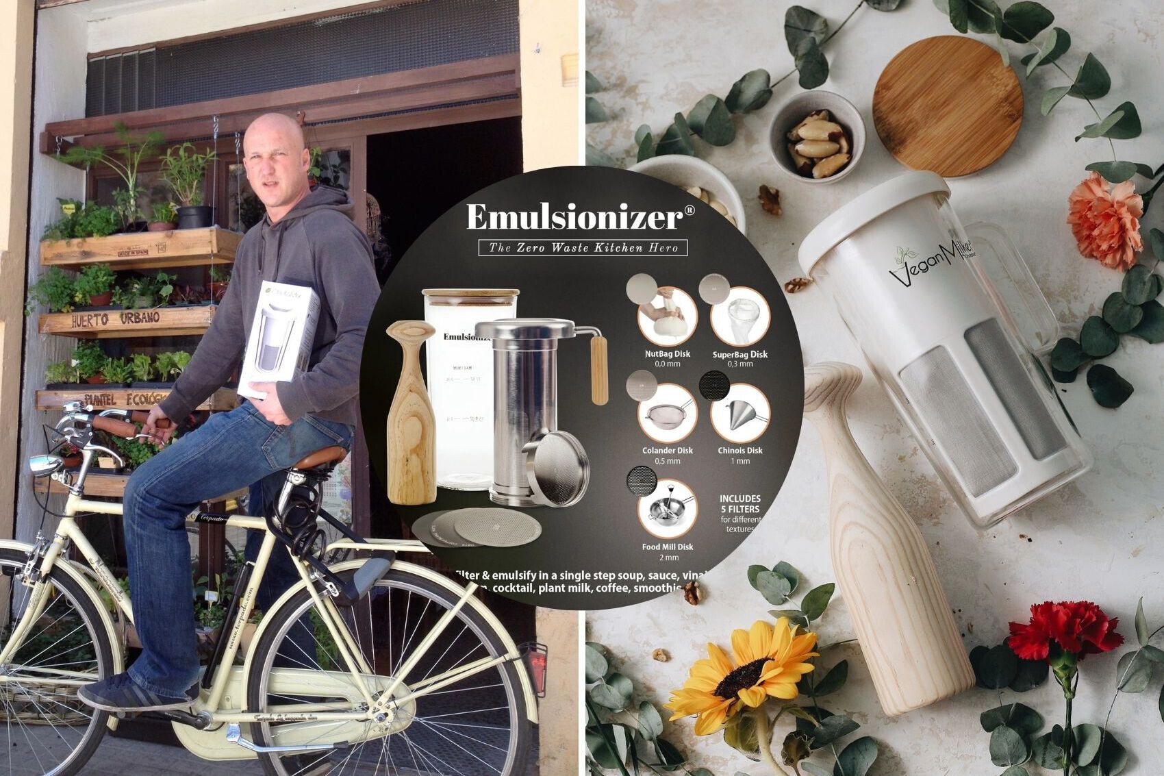 “Es un filtro emulsionador: puedes poner cualquier alimento o ingrediente, dentro de cualquier líquido, sea agua, vinagre, vino y más", detalla Andoni con gran entusiasmo. Titulado The Zero Waste Kitchen Hero, a comienzos del 2025 fue galardonado como el "Mejor Producto Nuevo 2025" en la feria Biofach (Núremberg). No hay alimento que no se pueda transformar con el Emulsionizer, simplificando la cocina de todos los días, sin necesidad de múltiples herramientas, en un un práctico tamaño que no supera las dimensiones de una batidora de mano y "lo hemos hecho todo en España" cuenta Andoni.