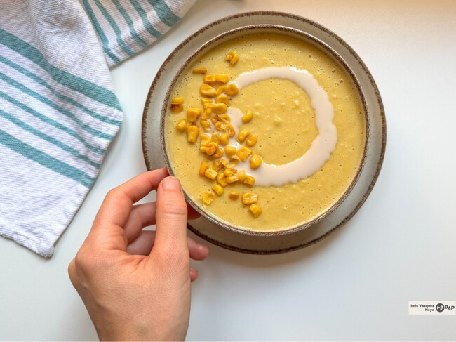 En una olla, derretir la mantequilla a fuego medio. Agregar la cebolla picada groseramente y cocinar hasta que este transparente, de 3 a 4 minutos. Añadir los granos de maíz (reserva unos cuantos para decorar al final, de manera opcional) y sofreír con la cebolla unos 2 minutos más. Agregar a la olla el caldo de verduras o agua y cocinar unos 20 minutos a fuego medio. Pasado ese tiempo, incorporar la nata liquida y triturar muy bien con batidora de mano. Una vez que tenga la consistencia deseada, servir en un cuenco con los granos de maíz restantes por encima.