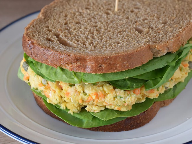 A mano, con tenedor o un prensador de patatas, o con un robot o procesador de alimentos, el sándwich de ensalada de garbanzos es rapidísimo y facilísimo de hacer. Puedes usar las sobras de la ensalada que hayas hecho para comer o que tengas en la nevera de la víspera, pero tampoco tardarás mucho más en preparar el relleno desde cero con una receta sencilla y lo que tengas por la despensa.
