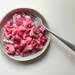Típicamente, funciona como guarnición para platos intensos y condimentados, como el pollo al horno o el arroz con pollo, que ayuda a limpiar el paladar entre bocado y bocado. O bien, una porción de arroz blanco o quinoa para absorber el aliño de la mayonesa y la remolacha.