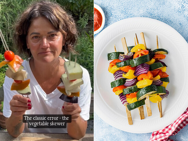 Nos lo advierte Genevieve Taylor, chef especializada en la cocina con fuego, gran experta británica en barbacoas, brasas y parrillas, autora de varios libros especializados en la materia. Es un “error clásico”, comenta en una de sus publicaciones en redes sociales, donde comparte trucos y consejos. Mezclar diferentes verduras en una misma brocheta es un gran error.