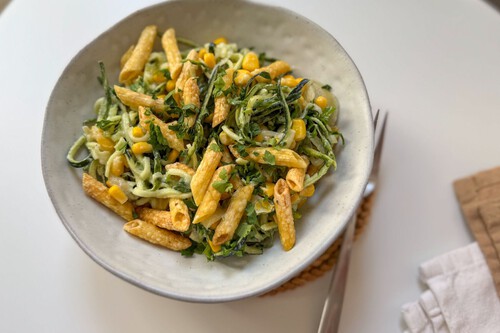 Esta ensalada de pasta admite infinitas variaciones; invito a jugar con las bases de verdes, sumando verduras crudas o templadas, especias aromáticas o matices más exóticos para aprovechar lo que se tenga en la nevera.