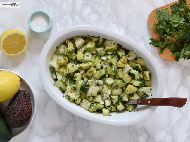 Sea como sea, con los ingredientes sacados de la nevera ya fríos, la ensalada la tienes montada en 15 minutos y sienta de maravilla cuando el cuerpo pide algo fresco e hidratante, lleno de vitaminas y con sabor. Es además saciante, sin ser pesada, gracias a la fibra de los vegetales y la grasa saludable del aguacate. Podríamos agregar más proteínas y nutrientes con cualquier queso fresco o tierno, como un feta en dados, tipo Burgos o bolitas de mozzarella.