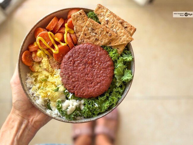 Para una comida en tiempo récord, mi propuesta de hoy se compone de una base de vegetales crudos y cocidos, arroz, crackers y la burger de Better Balance. Posicionada en el mercado hace unos años ya, solo hay que calentar el medallón de 200 gramos unos minutos por cada lado en la sartén a fuego medio. Con 1 a 2 minutos es suficiente; cuidado con el exceso de cocción, ya que cocinar por demasiado tiempo puede eliminar la humedad, resultando en una hamburguesa seca y con una textura poco agradable.