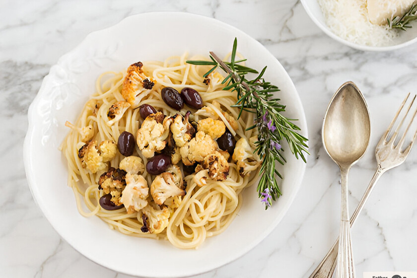 Preparar una cena nutritiva no tiene por qué ser complicado, y este plato de espaguetis con coliflor picante y aceitunas negras es la prueba. Destaca por su sencillez y rapidez, ya que mientras la pasta se cuece, se cocina la coliflor en el horno.