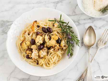 La coliflor y las aceitunas negras son los sorprendentes protagonistas de este plato de espaguetis