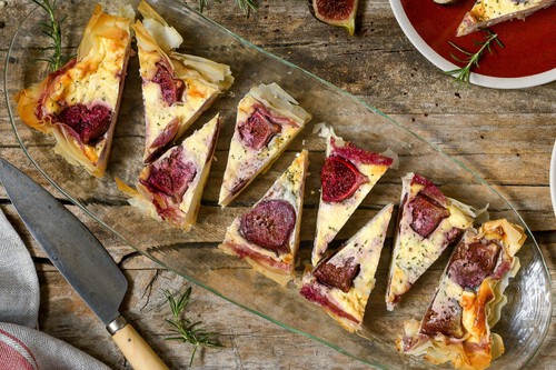 Lo cierto es que la masa filo proporciona un resultado ligero y muy crujiente que añade elegancia al bocado de cada porción de esta tarta salada, si bien es verdad que también hace que sea más delicada. En cualquier caso, la combinación de higos frescos con el cremoso relleno aromatizado con romero es una delicia que sorprende la primera vez.