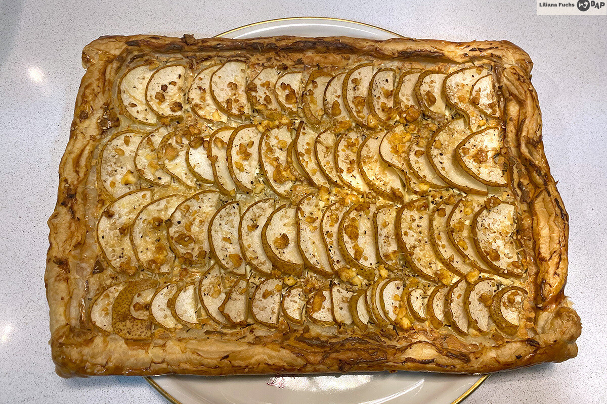 Tirando de nevera y despensa fui a lo fácil: combinar frutas y queso. Dicho y hecho; una base de queso crema aderezado con hierbas, pimienta, y un toque de mostaza, pera limonera cortada en láminas finas -sin pelar, ¿para qué perder ese tiempo?-, queso feta desmenuzado, semillas de sésamo y tomillo. Media hora de horno después teníamos una tarta salada fina, crujiente y deliciosa lista para servir cortada en porciones cuadradas.