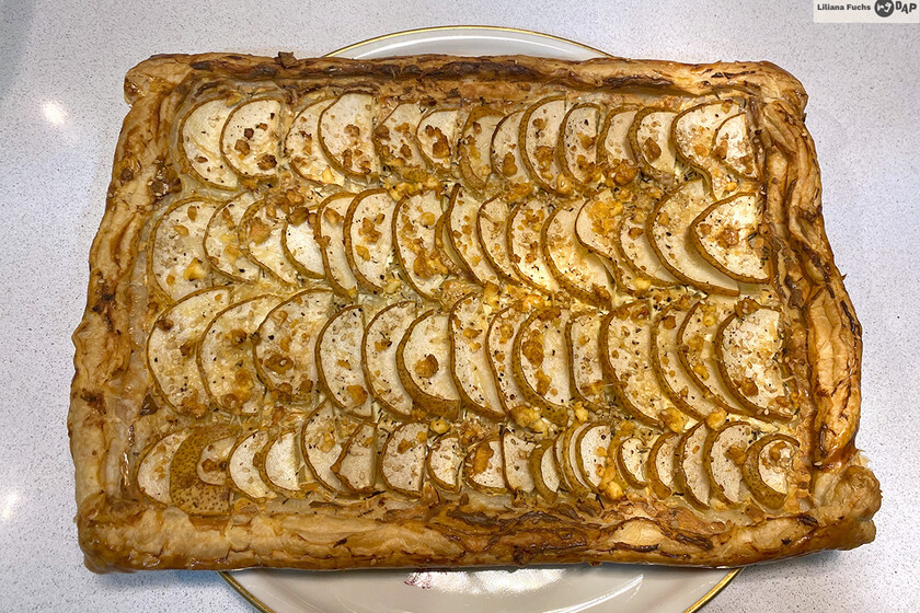 En esta ocasión marqué los bordes ligeramente para doblarlos sobre la propia masa y así crear un marco que abrazara parte del relleno, pintándolo además con huevo batido, pero se puede simplemente dibujar el perímetro de la masa presionando con un cuchillo o similar, sin cortar el hojaldre. Además, pasados unos 20 minutos con el horno a 200ºC, añadí una buena cantidad de parmesano recién rallado directamente encima de las peras, dejando que se fundiera en el tiempo final de horneado.