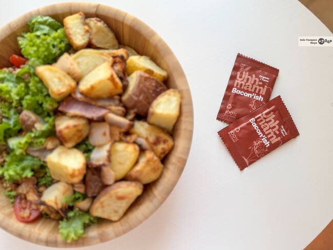 De manera similar, al degustar el Bacon'ish, también me encontré con un aroma penetrante, esa mezcla compleja de notas ahumadas, saladas y grasosas propias del bacon. A la vista, es un polvo fino de color amarillo, sin copos ni cristales, que no se apelmaza y se espolvorea fácilmente sobre los ingredientes. Cuesta creer que no contiene ningún producto animal, lo cual me parece increíble después de probarlo. El nivel de picante es mínimo, y diría que tiene una pizca de dulce muy atractivo. Tenia mis dudas sobre el grado de salinidad del polvo, sabiendo que es una estrategia recurrente en los sazonados, pero me llevé una grata sorpresa. Este sabor en particular, lo veo dirigido para el para el público flexitariano que busca más opciones veganas, y este tipo de condimentos realmente ayudan en la transición.