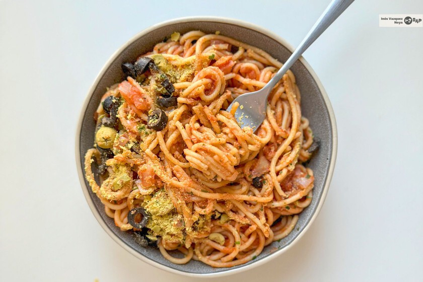 La base de espaguetis aporta la energía necesaria para cerrar el día, mientras que la salsa de tomate añade la jugosidad ideal. El toque distintivo lo agrego con aceitunas negras y verdes para contrastar con la suavidad de la pasta; estas se podrían reemplazar también por alcaparras para un matiz más ácido. Finalmente, la levadura nutricional no solo enriquece el perfil con proteínas y vitaminas, sino que también aporta ese sabor 'umami' que hace cada bocado mucho más atractivo.