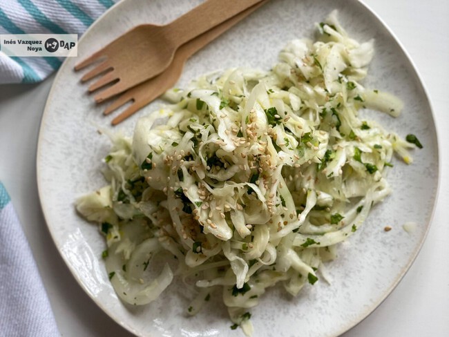 La col blanca o repollo es perfecta para hacer ensaladas y platos muy ligeros e hidratantes que no requieren cocción alguna. Es famosa la coleslaw o ensalada de col americana, pero también tenemos ejemplos en Europa como la ensalada de col griega o lahanosalata. Son fáciles a más no poder, aunque si quieres mejorar la textura, vas a necesitar agua con gas.