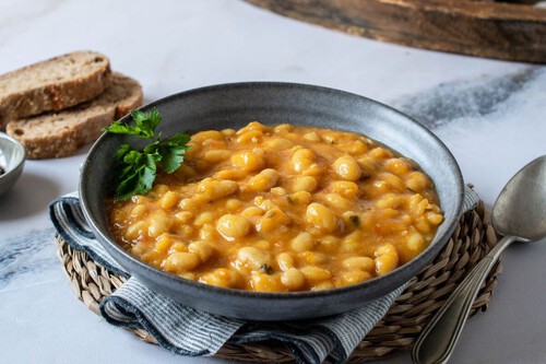 Es un potaje a la vieja usanza, con ingredientes baratos y sencillos como son las alubias blancas, el tomate, el ajo y la cebolla, pero que adquiere una nueva dimensión con la riqueza de sus especias aromáticas. Ya sabes que si usas alubias secas hay que dejarlas a remojo al menos toda la noche, y que cocinando con olla rápida tardarás mucho menos. Para una urgencia, no pasa nada por recurrir a las alubias de bote.