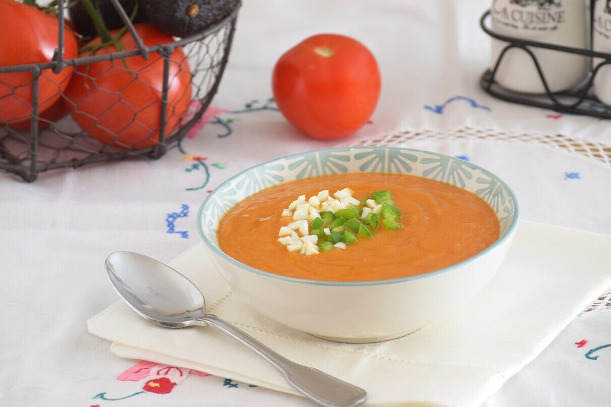 La receta es simple a más no poder: solo hay que triturar medio kilo de tomates maduros con 250 g de pulpa de aguacate pesados sin hueso, que estén también maduros y cremosos, y añadir los condimentos al gusto —aceite de oliva virgen extra, sal, ajo y vinagre—. Si me quedo corta con el aguacate o quiero que quede más espeso aún, sumando proteínas, añado un huevo duro pelado o solo la yema, triturando todo bien.