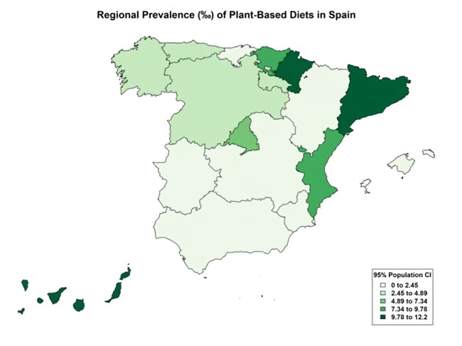 Donde sí se revelan notables diferencias es en las zonas geográficas. Hay una mayor adherencia a dietas vegetales en las regiones del noreste del Mediterráneo (Cataluña y Valencia), las regiones del centro norte (País Vasco y Navarra), y las Islas Canarias; en la otra cara, las regiones meridionales y centrales presentan la menor adherencia. "Estas diferencias regionales pueden reflejar disparidades culturales y económicas subyacentes no asociadas con el consumo medio regional de carne por persona, donde Navarra presentaba el mayor consumo de carne", afirman los autores.