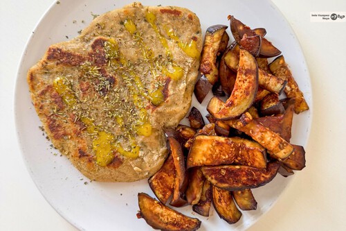 En esta ocasión elegí una opción sin carne: es de seitán de la marca Vanetta y está cocida lentamente en la sartén para lograr ese color dorado y una superficie ligeramente crujiente. Es una pieza de bocado firme y sabroso, al ser una 'carne vegetal' a base de gluten de trigo, aporta la saciedad necesaria para afrontar el resto del día o descansar bien por la noche, especialmente cuando se termina con un plus de orégano seco y un hilo de mostaza o aceite aromatizado por encima, que le queda increíble al seitán.