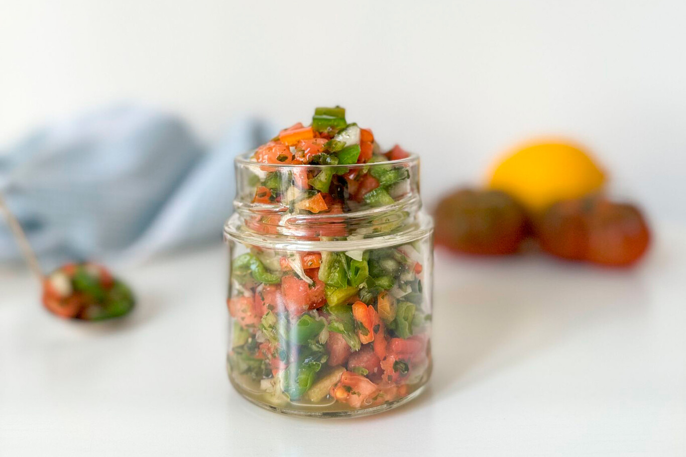 Tomar los pimientos, la cebolla blanca y el tomate y cortar en pequeños cubos, procurando que todos tengan un tamaño similar de ser posible. Volcar en un cuenco y condimentar con la sal, pimienta, vinagre de vino y aceite de oliva virgen extra. Perfumar con el zumo y ralladura de limón. Remover.