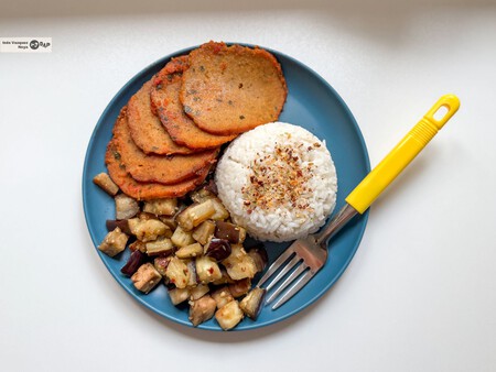 Es una cena potente pero equilibrada, que invita a mezclar cada bocado para disfrutar de una experiencia plant-based redonda. Además, es una combinación versátil basada en tres pilares que puedes adaptar a tu gusto: sea el seitán por pinchos de tofu adobados o tempeh, cambia el arroz por quinoa o cuscús a la naranja, o elige batata o calabacín en lugar de berenjena.