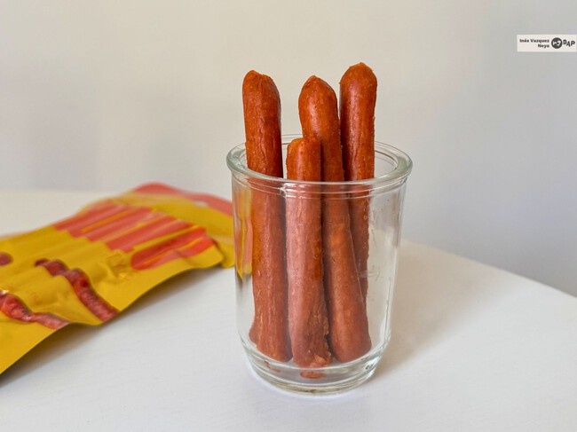Eso sí, la lista de ingredientes es larga, como suelen ser también muchos aperitivos de carne industriales; incluyen soja texturizada, aceite de soja, concentrado de proteína de soja, harina de konjac, glucosa, azúcar y colorantes como concentrado de rábano para el tono rojizo. No necesitan refrigeración al estar envasados al vacío, lo que los hace perfectos para llevar a cualquier lugar.