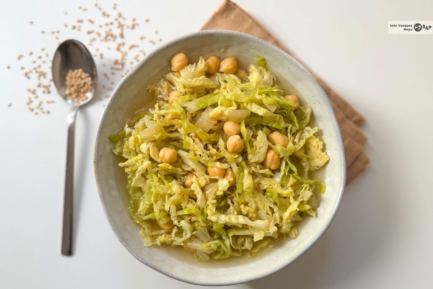 Este es uno de esos platos pobres en ingredientes pero ricos en sabor, muy típico de la cocina mediterránea. El dúo de garbanzos y repollo tiene una sinergia perfecta: mientras la legumbre aporta una base sólida de proteína vegetal y fibra de alta calidad, la col suma una dosis extraordinaria de vitamina C y antioxidantes que refuerzan el sistema inmunológico.