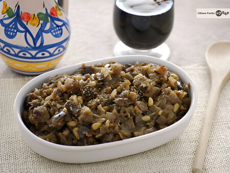 Pasado ese tiempo, integramos la berenjena a medio cocinar, unos piñones y añadimos regamos con un chorro de vino tinto, dejando que evapore el alcohol, y cocinamos a fuego muy lento durante unos 40 minutos o hasta que veamos que el plato queda jugoso, pero no encharcado. Tras eso, sazonamos con orégano seco y servimos.