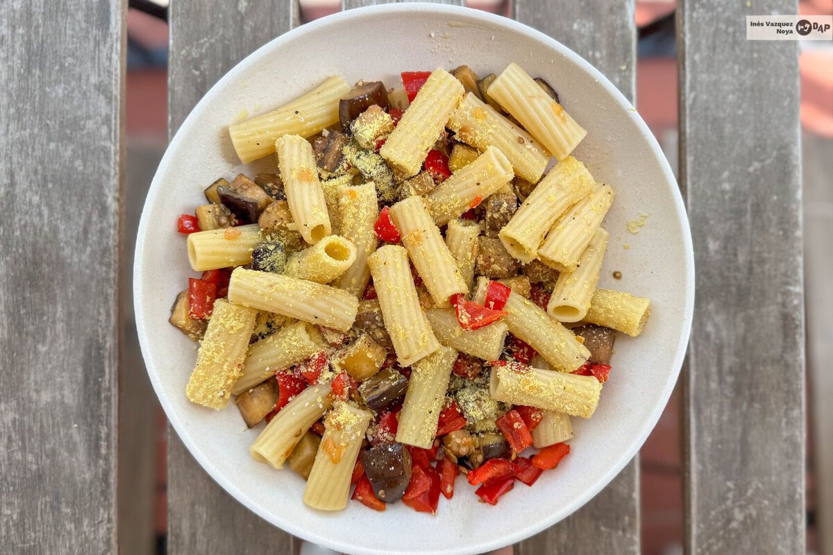 El secreto está en la preparación rápida: mientras la pasta se cuece, los vegetales se saltean a fuego alto, permitiendo que sus sabores se intensifiquen y caramelicen en poco tiempo. La berenjena, suave y con un ligero dulzor, se une al pimiento rojo, que aporta un toque ahumado, mientras que la cebolla, con su dulzura natural, unifica todos los elementos. Esta combinación crea un sofrito rápido que envuelve la pasta a la perfección.
