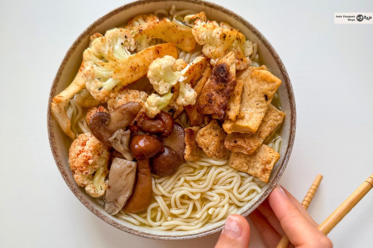 Es importante el punto del caldo, al ser la base de sabor que lo sostiene todo y el responsable de esa primera sensación de calor al dar el primer sorbo. El toque distintivo lo dan los acompañantes: la coliflor, dorada unos minutos en la sartén con pimentón, queda increíble, las setas hidratadas y la soja texturizada gruesa. Me gusta cómo la soja absorbe todo el sabor del caldo; queda jugosa y con una consistencia que te deja súper satisfecho. Es un plato que lo tiene todo: es nutritivo, pero sobre todo, es puro disfrute.