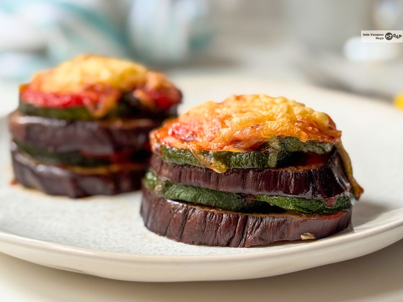 Si tienes un aro de emplatar, colócalo en el centro del plato o o simplemente apilar las verduras con cuidado: una rodaja de berenjena, dos de calabacín, salsa de tomate, berenjena, calabacín y salsa de tomate, hasta tener una torrecita. Terminar con un puñado de queso gouda por encima y gratinar por 2 a 3 minutos al horno a 200 grados hasta que funda.
