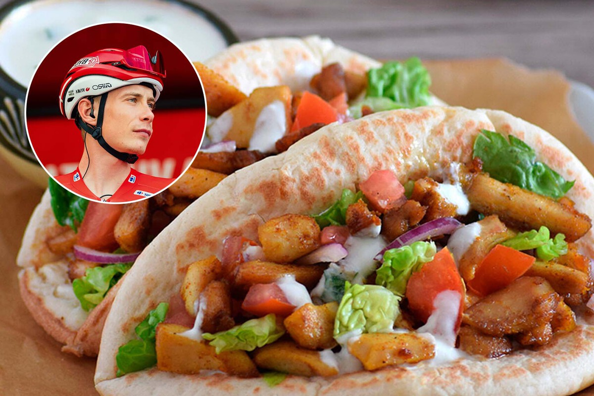 En este caso, explicaba Lambrecthse a NOS, lo que hace para satisfacer el mono de Vingegaard es freír un poco de pollo con las típicas especias shawarma, habituales en los kebabs, y envolviéndolo en un wrap con lombarda, cebolla y salsa de ajo.
