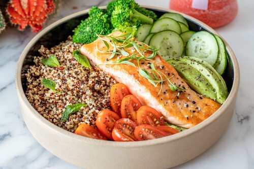 - Salmón a la plancha con quinoa, aguacate y hummus de garbanzos con semillas de calabaza tostadas.