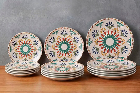 Este set de platos de gres consta de doce piezas, es decir, podremos servir hasta a cuatro comensales. Su diseño recuerda a las baldosas portuguesas tan coloridas y llamativas. Sigue un diseño entre floral y geométrico, que no pasará desapercibido y pondrá un toque de color en cada ocasión.