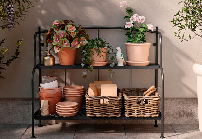 Todo jardín o terraza que se precie debe tener alguna maceta o flor para aportar algo de vida. Y si no queremos tenerlas por el suelo para no tropezar con ellas en Ikea hemos fichado una estantería por 29,99 euros, de acero, y con un estilo parisino muy llamativo.