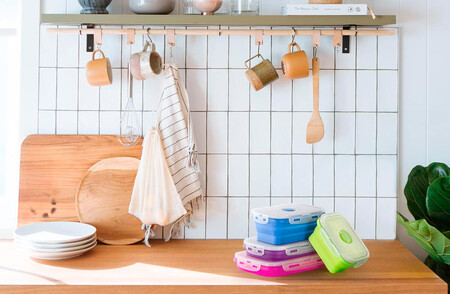 Aunque los tuppers de cristal o de plástico se pueden meter unos dentro de otros, sigue siendo un engorro. Con este sistema de fiambreras plegables podemos almacenarlos unos sobre otros, con sus tapas puestas y sacarlos del armario con una sola mano.