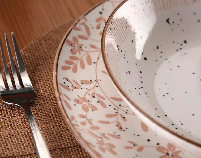 En cuanto al diseño: mientras que el plato grande y el de postre tiene un estampado floral, el hondo va en contraste con una cenefa a rayas; pero todos siguen la misma gama cromática. El filo de cada pieza es de un tono marrón oscuro, lo que hace que quede ideal con manteles beige o cristalería tanto fina como informal.
