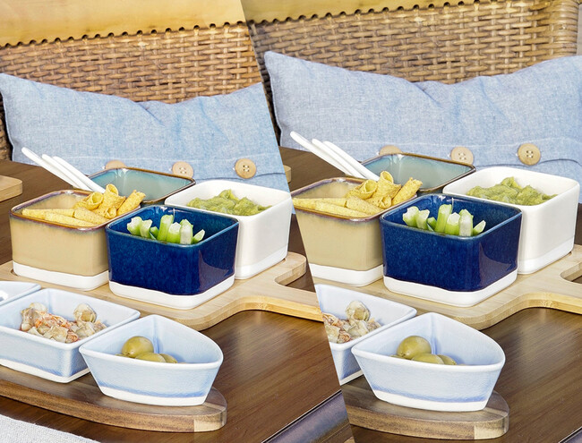 Cuencos a juego en los que servir salsas de todo tipo así como gildas, aceitunas o unos tacos de queso
