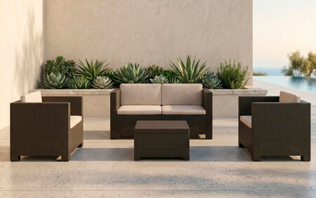 Si algo crea este conjunto, es una cómoda y bonita zona en la que relajarse al sol. Pero también disfrutar de aperitivos, comer de picoteo en la mesa baja y hasta disfrutar de una merienda al aire libre. El set se compone de dos sillones individuales, uno de dos plazas y una mesa baja que también es baúl. Además, también incluye los cojines, los cuales podremos guardar en la mesa baúl para que no se estropeen.