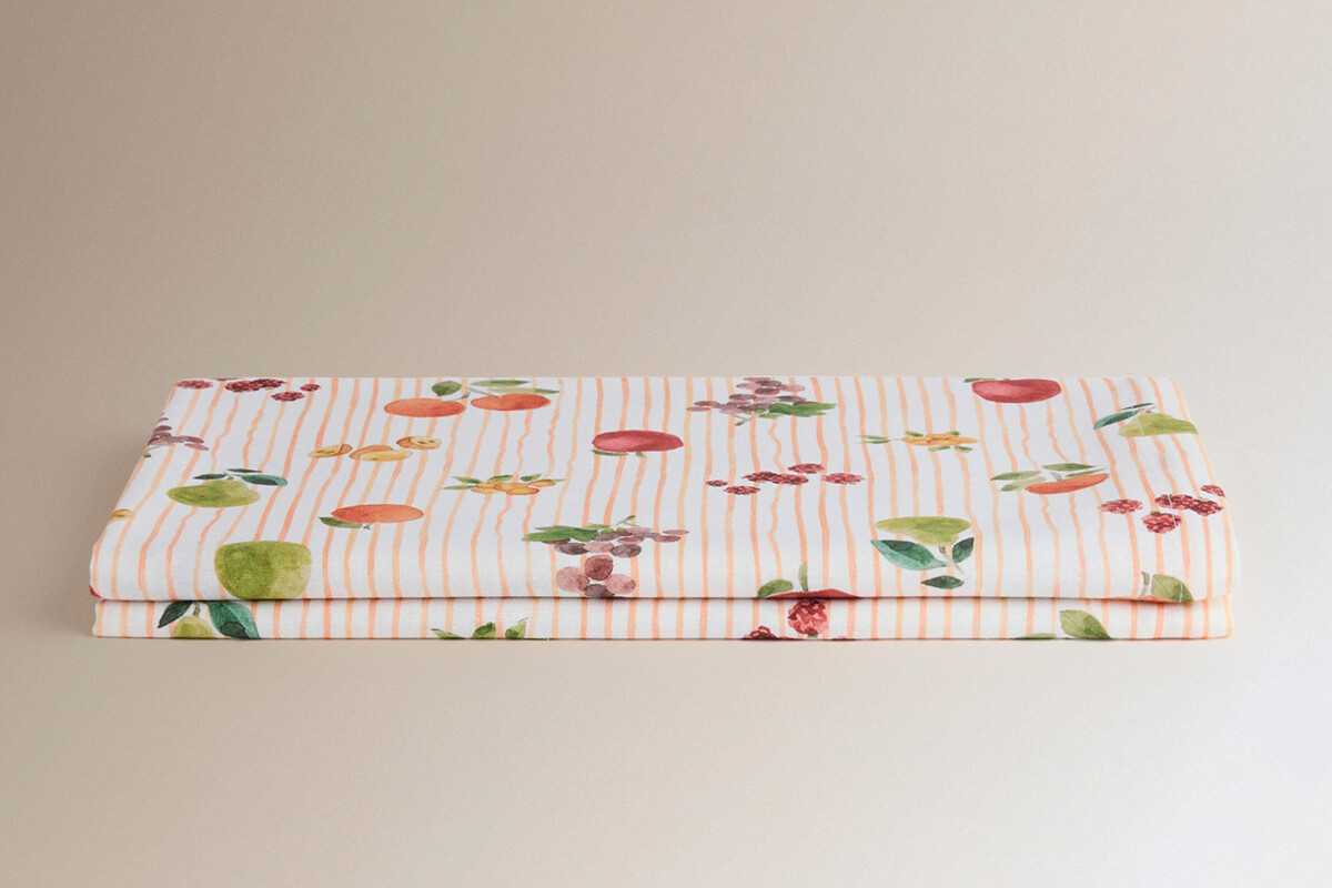 Al contrario que los de hule o los que son más de plástico, este mantel tiene un tacto muy suave, así como una caída muy natural. Además, tiene un bonito estampado en líneas anaranjadas que parecen hechas a mano, así como las distintas frutas que vemos repartidas por el diseño, las cuales parecen pintadas con acuarela. Es atemporal, perfecto para poner un toque natural e incluso cálido a la mesa.