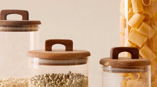 Se trata de unos tarros de borosilicato con tapa de madera de acacia barnizada que tienen una junta de silicona para mayor hermeticidad. Son sencillos, pero mejores que los tarros o envases de plástico y, además, suman en decoración haciendo que la despensa se vea más ordenada y despejada. Segun el tamaño tiene un precio: