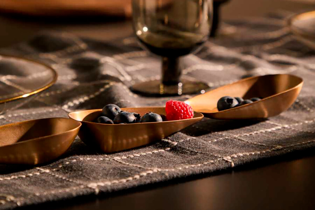 Hablamos del set de boles Aruc, los cuales parecen recipientes individuales, pero están unidos de modo discreto para que podamos colocarlos en el centro de la mesa. Son ideales para comer de picoteo con amigos o familia, sirviendo salsas o aperitivos típicos como frutos secos, aceitunas etc. Son de acero inoxidable y acabados en latón dorado que le dan ese toque sofisticado incluso al tapeo más informal.