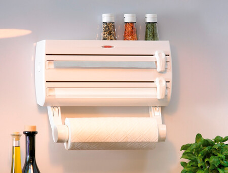 Este accesorio es un triple portarrollos de cocina en el que podemos almacenar papel film, de plata y en el soporte inferior el de cocina de siempre. Así despejaremos los cajones y evitaremos que los dos primeros acaben arrugados o hechos un murruño insalvable. Además de poder cortarlos y utilizarlos más cómodamente a diario.