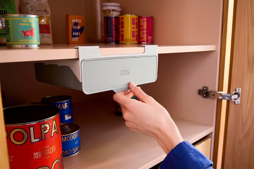 No es más que un sencillo cajón que se coloca bajo las baldas de los armarios. Pero lo que ganaremos en almacenamiento para cosas pequeñas lo notaremos desde el minuto uno. Pues es un espacio perfecto para almacenar desde conservas de marisco, hasta bolsas de basura e incluso condimentos de todo tipo, o hasta accesorios de limpieza de cocina como estropajos o bayetas de recambio.