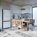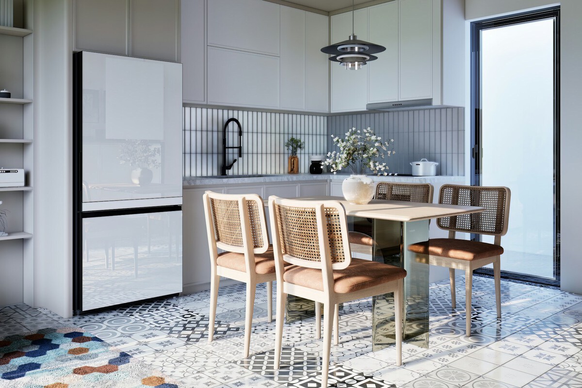 Este suelo imita la baldosas de cerámica portuguesas que le darán a la cocina un toque de lo más cálido e incluso rústico, pero a todo color. Se trata de un suelo vinílico que se instala mediante "click", uniendo unas piezas con otras, el corte de la cenefa no se notará porque está diseñada para que se vea muy natural. Al no necesitar adhesivos es mucho más sencillo y podemos instalarlo sobre cualquier tipo de suelo, sea baldosa, terrazo o incluso parque.