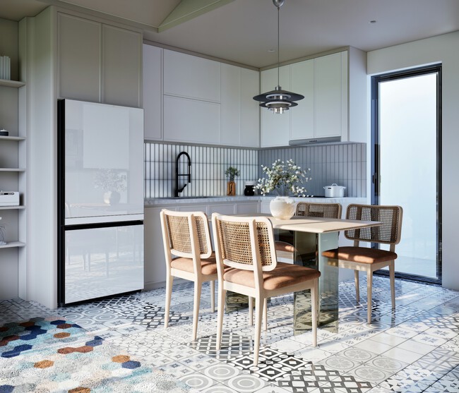 Este suelo imita la baldosas de cerámica portuguesas que le darán a la cocina un toque de lo más cálido e incluso rústico, pero a todo color. Se trata de un suelo vinílico que se instala mediante "click", uniendo unas piezas con otras, el corte de la cenefa no se notará porque está diseñada para que se vea muy natural. Al no necesitar adhesivos es mucho más sencillo y podemos instalarlo sobre cualquier tipo de suelo, sea baldosa, terrazo o incluso parque.
