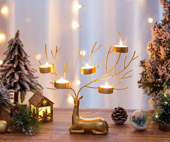 Los cuernos del reno son alargados y en ellos encontramos pequeños portavelas en los que poner las típicas velas de té. Es decir, esas pequeñas con base de aluminio que duran varias horas y que podemos elegir aromatizadas o simplemente para iluminar la mesa de forma tenue. Y que en Amazon encontramos el pack de 90 unidades por 16,99 euros.