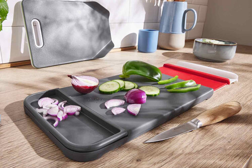 A simple vista, puede parecer una tabla de cortar cualquiera, pero realmente es mucho más útil que las que podamos encontrarnos de madera o plástico. Ya que en su interior alberga dos tablas más que podemos usar para que no se produzca la temida contaminación cruzada. Así como para no cortar pescado o carne y luego cortar verduras en una misma tabla y que se queden los sabores.