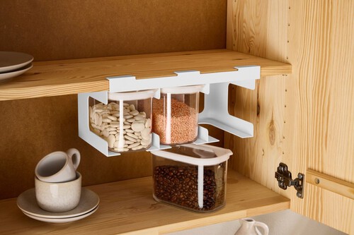 Esto es gracias a que van sobre un soporte, el cual a su vez se encaja en las estanterías quedando por debajo de ellas. Y no necesita tornillos ni tenemos que taladrar los muebles, sino que se instala mediante acople que queda fijo. De modo que podemos meter y sacar los botes tantas veces como sea necesario.