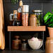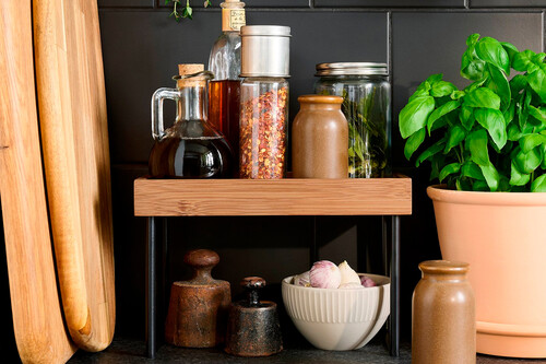 Esta solución para el almacenaje sobre la encimera es tan cómodo como funcional y versátil. Pero también suma en decoración y modernidad, gracias a su combinación de materiales. Pues la bandeja es de bambú barnizado y los soportes de acero con acabados en negro, juntos crean una estructura robusta y resistente.
